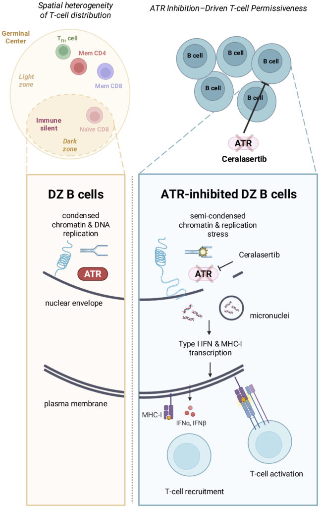 Abstract: The germinal center (GC) dark zone (DZ) and light zone represent distinct anatomical regions in lymphoid tissue where B cell proliferation, immunoglobulin diversification, and selection are coordinated. Diffuse large B cell lymphomas (DLBCLs) with DZ-like gene expression profiles exhibit poor outcomes, though the reasons are unclear and are not directly related to proliferation. Physiological DZs exhibit an exclusion of T cells, prompting exploration of whether T cell paucity contributes to DZ-like DLBCL. We used spatial transcriptomic approaches to achieve higher resolution of T cell spatial heterogeneity in the GC and to derive potential pathways that underlie T cell exclusion. We showed that T cell exclusion from the DZ was linked to DNA damage response (DDR) and chromatin compaction molecular features characterizing the spatial DZ signature, and that these programs were independent of activation-induced cytidine deaminase (AID) activity. As ATR is a key regulator of DDR, we tested its role in the T cell inhibitory DZ transcriptional imprint. ATR inhibition reversed not only the DZ transcriptional signature, but also DZ T cell exclusion in DZ-like DLBCL in vitro microfluidic models and in in vivo samples of murine lymphoid tissue. These findings highlight that ATR activity underpins a physiological scenario of immune silencing. ATR inhibition may reverse the immune-silent state and enhance T cell–based immunotherapy in aggressive lymphomas with GC DZ–like characteristics.