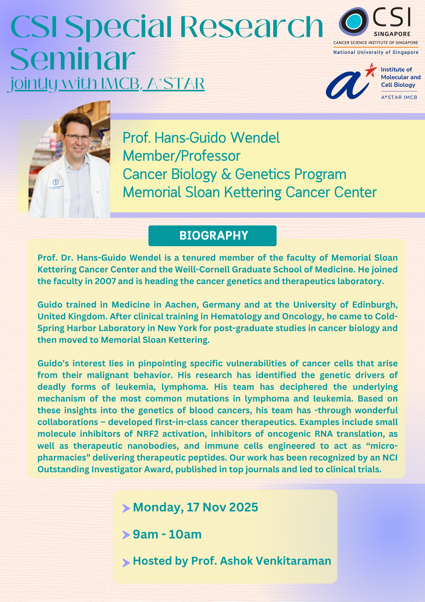 November 17 @ 9:00 am - 10:00 am [Zoom] CSI Special Research Seminar jointly with IMCB – Prof. Hans-Guido Wendel